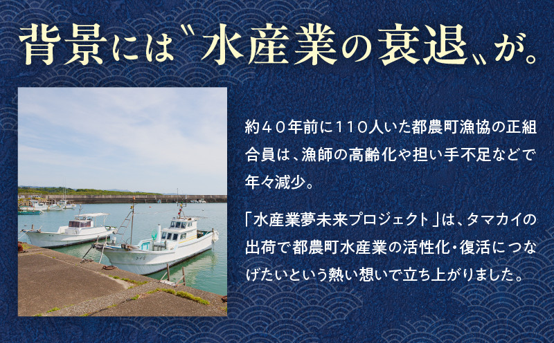 かつて110人以上いた漁協の正組合員が、今ではごくわずかに。高齢化や担い手不足による水産業の衰退が深刻な課題となっています。“水産業夢プロジェクト”は、「タマカイ」の出荷で都農町水産業の活性化・復活につなげたいという熱い想いで立ち上がりました。“都農町といえ「タマカイ」”と言われるように真面目にコツコツと頑張っていきます。