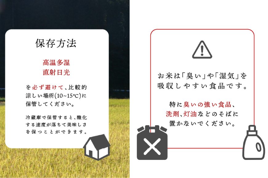 ●お米は臭いや湿気を吸いやすい食品です。特に臭いの強い食品・洗剤・灯油などのそばに置かないでください。