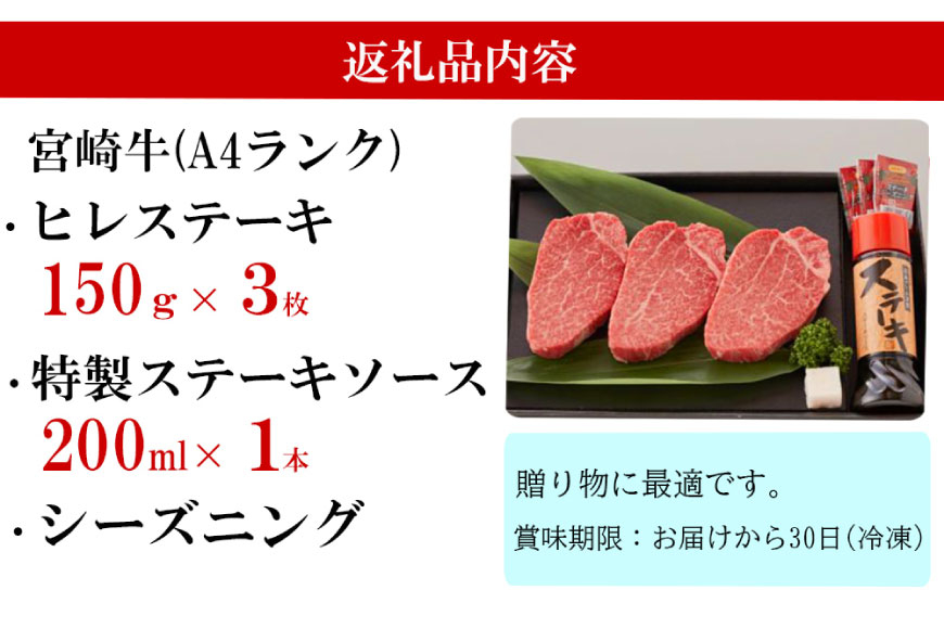 【希少部位】宮崎牛ヒレステーキ!特製ステーキソース付き!贈り物にも◎ 宮崎牛 A4 ヒレステーキ 150g×3 合計450g ステーキソース付き ギフト箱入り [南海グリル 宮崎県 美郷町 31bg0014] ブランド牛 冷凍 国産 牛 肉 南海グリル 希少部位 3D急速高湿冷凍 旨味 ステーキ