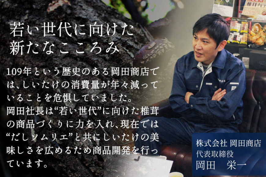 原木で育った乾しいたけの「おだし」を口にした時にひろがるゆたかな味わい、だしを引く時のあのゆたかな気持ちと時間を未来へと伝えて行くため、