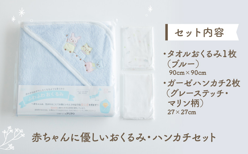 【日本製】赤ちゃんの肌着メーカーが作った赤ちゃんにとって優しいタオルとハンカチ 赤ちゃんに優しいおくるみ・ハンカチセット[ブルー]| おくるみ フード付き ガーゼ ハンカチ 沐浴 授乳 タオル ベビー用品 ベビーグッズ 赤ちゃんグッズ 赤ちゃん ベビー 贈り物 ギフト 国産 日本製 |_Tk032-030