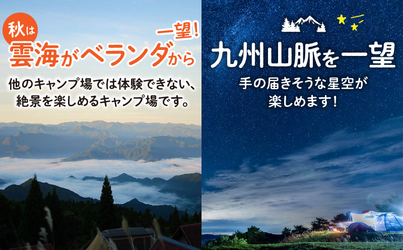 キャンパーに人気が高い、九州山脈を一望できるバンガローの一泊ご利用券です。