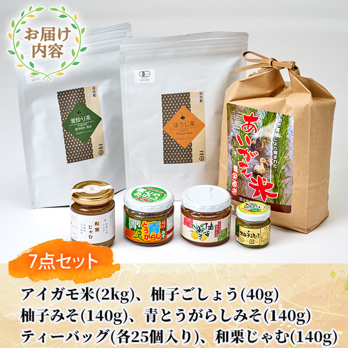 | 容量 | アイガモ米:2kg ティーバッグ2種(釜炒り茶、ほうじ茶:各25個入り) 柚子みそ:140g 青とうがらしみそ:140g 柚子ごしょう:40g 和栗じゃむ:140g ※アイガモ米は冷暗所に保管し、気温の高い6月頃~10月頃までは冷蔵庫での保管をお願い致します。 |