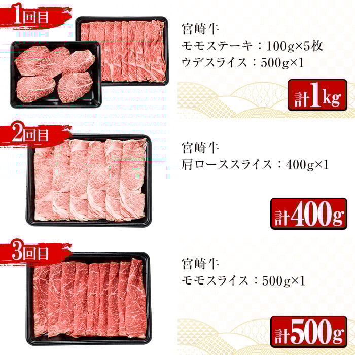 | 容量 | 【1回目】 宮崎牛モモステーキ:100g×5枚 宮崎牛ウデスライス:500g×1 【2回目】 宮崎牛肩ローススライス:400g×1 【3回目】 宮崎牛モモスライス:500g×1 【4回目】 宮崎牛肩ロース焼肉:400g×1 【5回目】 宮崎牛モモ焼肉:500g×1 【6回目】 宮崎牛バラスライス:500g×1 |