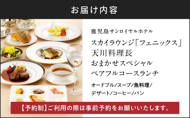 鹿児島サンロイヤルホテルより『ペアフルコースランチチケット』をご用意。 【5営業日以内に発送】鹿児島サンロイヤルホテル スカイラウンジ「フェニックス」天川料理長おまかせスペシャル ペアフルコースランチ K016-002