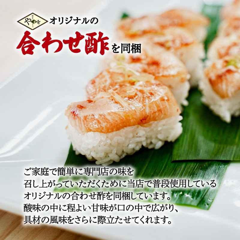 | 容量 | ・寿司ネタ 各1枚 (炙りさば、カンパチ、霧島サーモン、タイ) ・カニチラシ具材 1袋 ・やまを特製合わせ酢 1本 ・寿司専用米 3合 ・昆布(炊飯用) ・うちわ ・押し枠 |