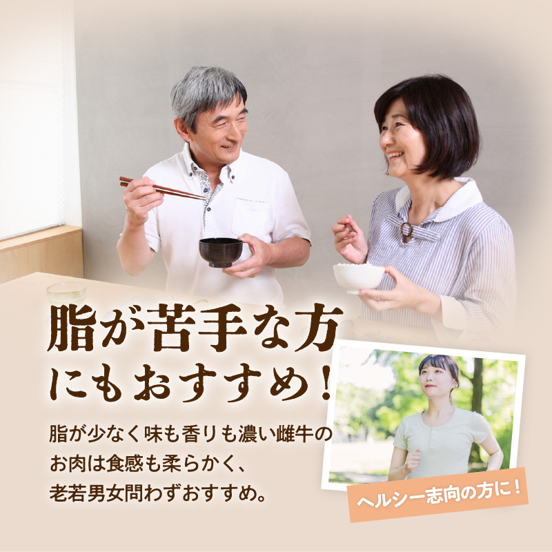 草などの健康的な飼料で育った経産牛の肉質は、サシが少なく、牛本来の旨みが引き出された、ヘルシーなお肉に。