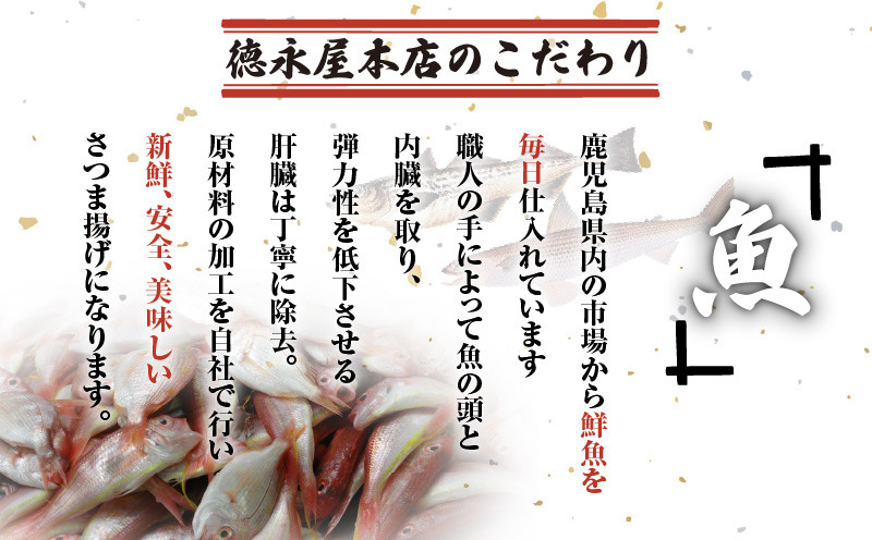 より新鮮で安全な魚にこだわり、鹿児島中央魚類市場から鮮魚を仕入れ、加工したすり身を合わせ、徳永屋本店独特の旨みを引き出した味に仕上げています。