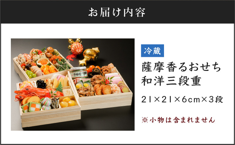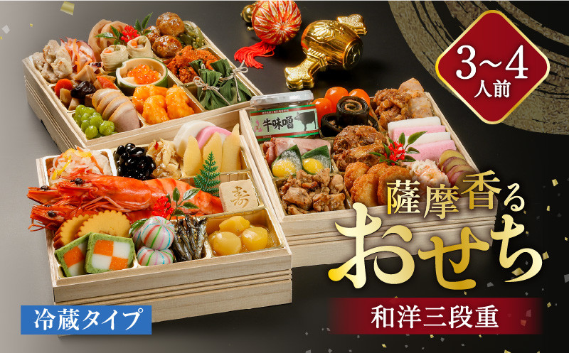 鹿児島県産黒豚や枕崎産鰹節、郷土料理のさつまあげ等を使用したおせちです。 薩摩香るおせち和洋三段重 K158-001