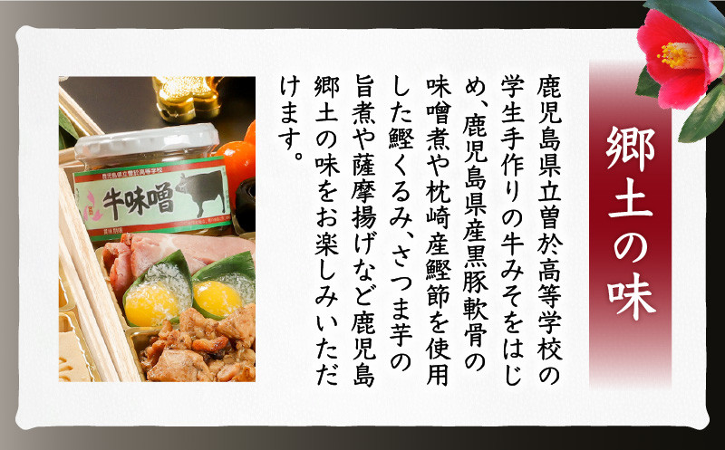 鹿児島県産黒豚や鹿児島県産ぶり、郷土料理のさつまあげ等を使用したおせちです