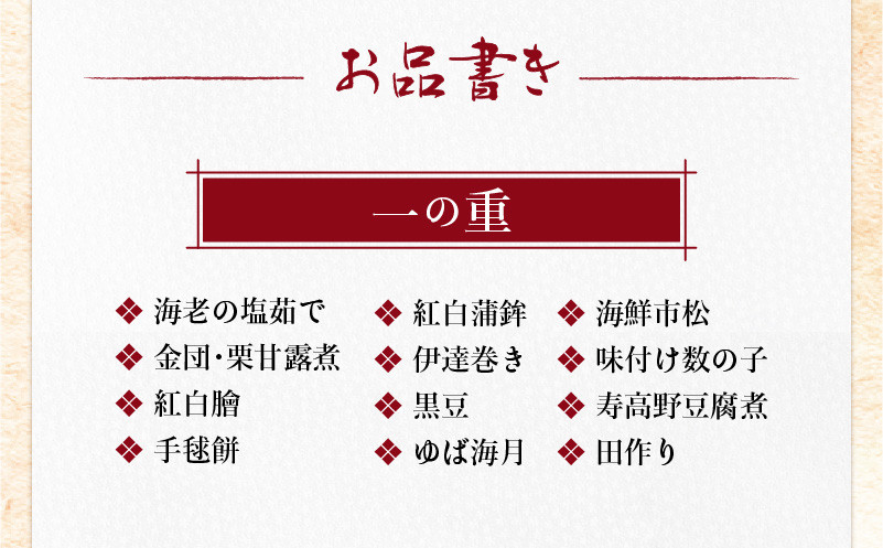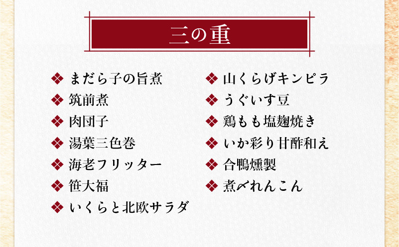 縁起物の大海老や黒豆、栗金団などに加えベーコンチーズドッグや海老チリフリッターなどお子様が喜ぶメニューも!