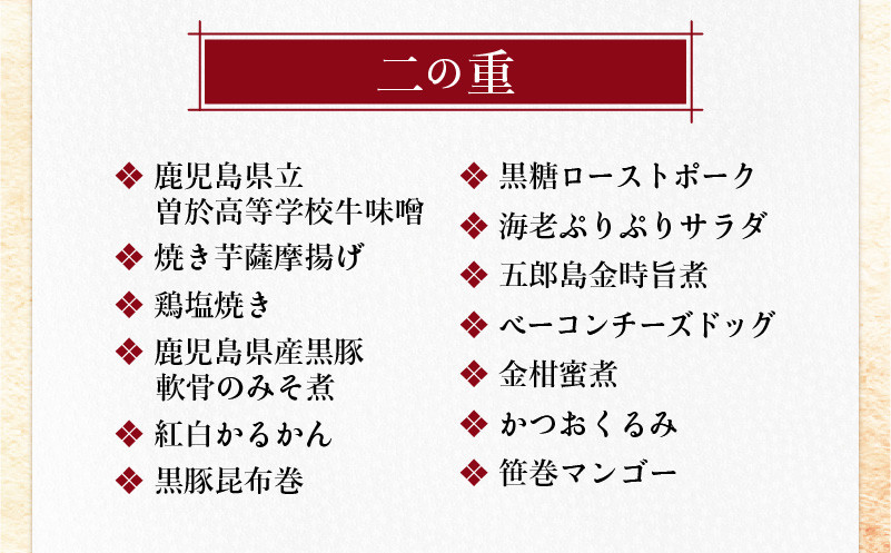 鹿児島県産黒豚軟骨の味噌煮や枕崎産鰹節を使用した鰹くるみ、さつま芋の旨煮や薩摩揚げなど鹿児島郷土の味をお楽しみいただけます。