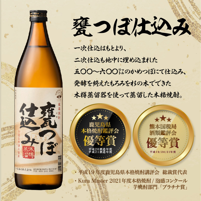 甕つぼで仕込み、木樽蒸留器で丁寧に蒸留するこだわり製法で生み出された、芳醇な香りと柔らかくコクのある味わい。