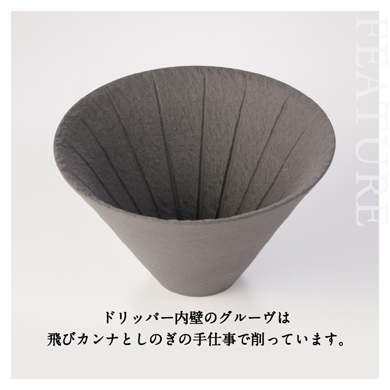 ドリッパー内壁のグルーヴには飛びカンナとしのぎの手仕事で削って作り、 本体も職人のろくろ成形と削り出しでひとつひとつに味わいがあります。