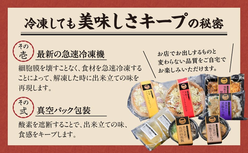 完全調理済みの「黒豚料理」。黒豚ピザ2種類、黒豚めし2種類、出汁茶漬け2種類。