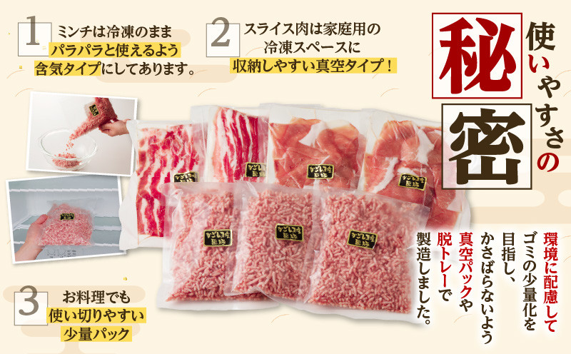 スライス肉は家庭用の冷凍スペースに収納しやすい真空タイプで、ミンチは冷凍のままパラパラと使えるよう含気タイプにしてあります。