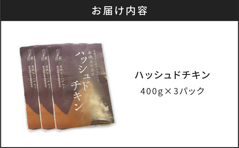 | 容量 | ハッシュドチキン 400g×3パック(1パック約2人前分) 【保存方法】 常温 ※開封後冷蔵 【原材料名】 黒薩摩鶏、玉葱、デミグラスソース 【原材料産地】 鹿児島県産 【製造・加工地】 鹿児島市 |