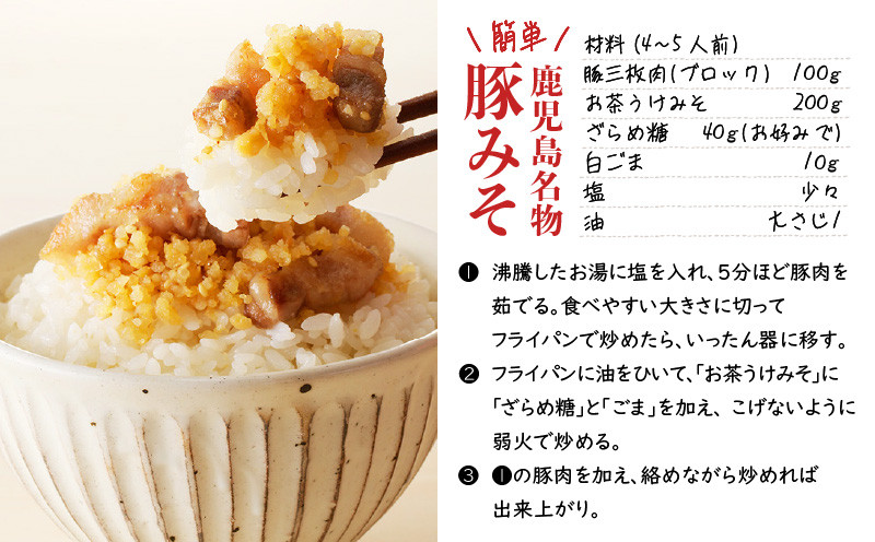 豚肉との相性は抜群で、豚肉と砂糖を加えて炒めて、鹿児島の名物として有名な「豚みそ」がご自宅で簡単に作れます。