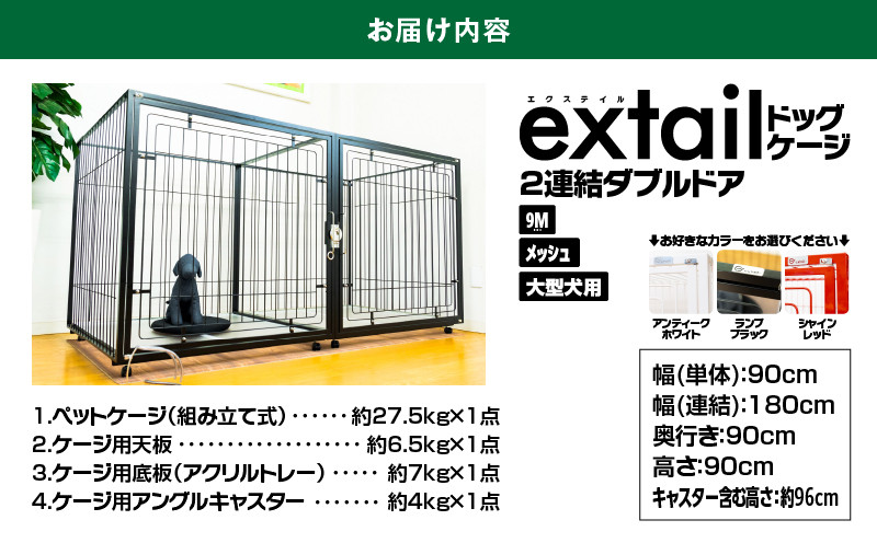 大型犬の2部屋タイプのケージで幅180cmの広々サイズです! <選べる>「大型犬用」ペットケージ 9Mメッシュ 2連結Wドア 白or黒or赤 K319-004
