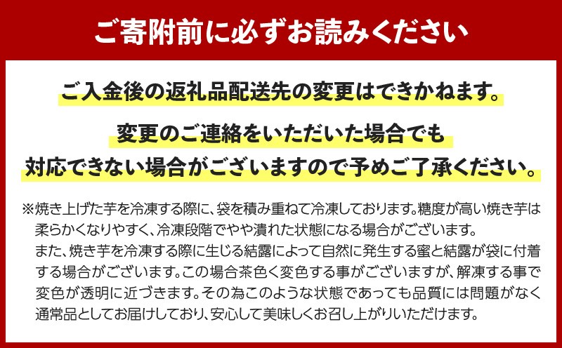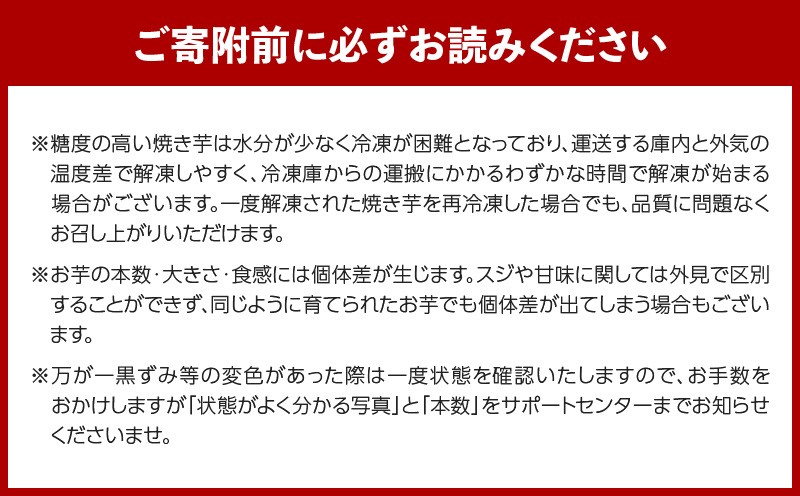 ※糖度の高い焼き芋は水分が少なく冷凍が困難となっており、運送する庫内と外気の温度差で解凍しやすく、冷凍庫からの運搬にかかるわずかな時間で解凍が始まる場合がございます。