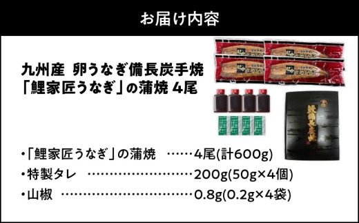 うなぎ専門店で食べる香ばしい蒲焼の味をご家庭でお楽しみください。 1644 九州産 卵うなぎ 備長炭手焼『鯉家匠うなぎ』の蒲焼4尾セット 計600g KN029-005-03