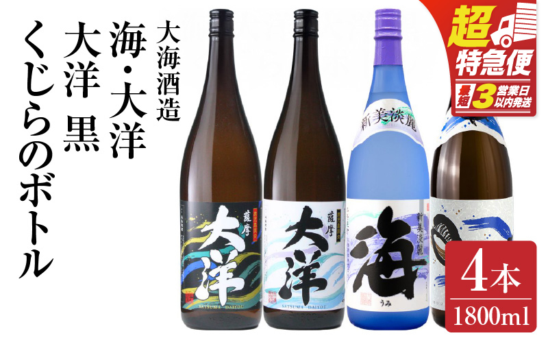 特約店限定販売の芋焼酎、鹿児島限定販売の芋焼酎が1本ずつ入った4本セット 【超特急便】2112 【お急ぎ】海 くじら 薩摩大洋 大洋黒 芋焼酎 25度 1800ml×各1本(計4本) 大海酒造 鹿児島県鹿屋市産 KN083-004