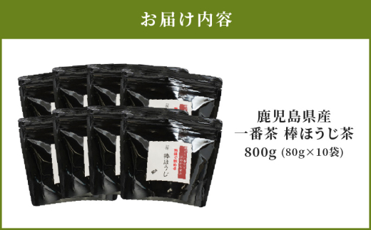 容量 | 一番茶 棒ほうじ茶800g (80g×10袋) 【原材料名】 緑茶 【原材料産地】 鹿児島県 【製造・加工地】 肝付町 |