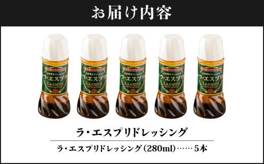 ドレッシング かけるだけで本格レストランの味!口コミで広まった自家製ドレッシング ドレッシング 和風 ラ・エスプリドレッシング280ml×5本 口コミで広まった自家製ドレッシング! 玉ねぎ たかの爪 椎茸 和風ドレッシング たれ 調味料 サラダ カルパッチョ【財宝】 KN021-033-02
