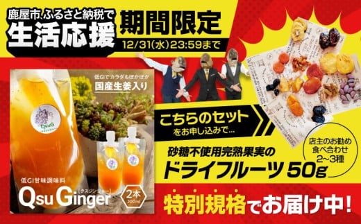 | 容量 | QsuGinger 200ml×2本 +砂糖不使用完熟果実のドライフルーツ 50g【期間限定!生活応援】 【保存方法】 常温 ※高温期は冷蔵保存 【原材料名】 国産米、国産もち米、米糀、醸造アルコール(13.5~14.5)煮切り済み、国産生姜、塩 【原材料産地】 すべて国産 【製造・加工地】 鹿屋市 |