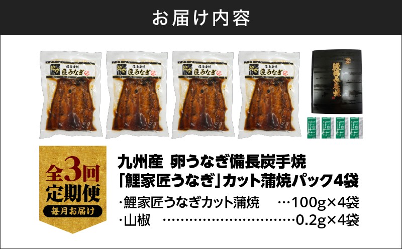 うなぎ問屋厳選!カットで食べやすいふっくら鰻です♪ 【全3回定期便】九州産 卵うなぎ 備長炭手焼『鯉家匠うなぎ』カット蒲焼パック 400g(4袋) KN029-T04-01