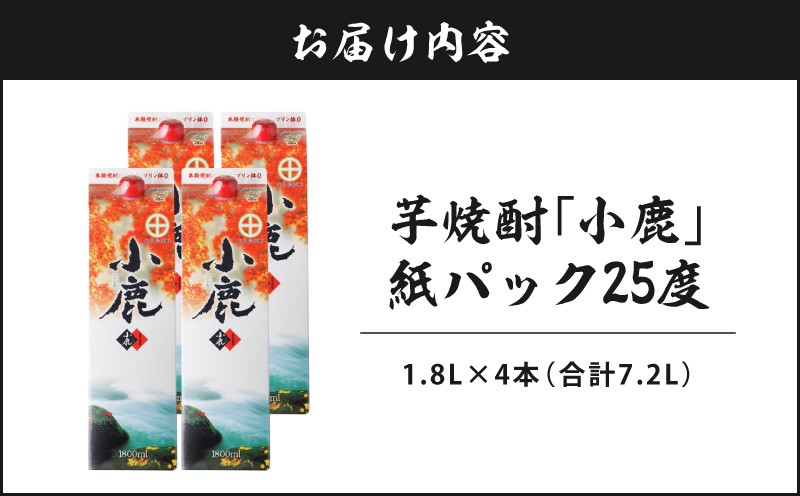 | 容量 | 芋焼酎「小鹿」紙パック 25度 1.8L×4パック 【保存方法】 常温 【原材料名】 さつまいも、米こうじ(国産米) 【原材料産地】 <さつまいも>鹿児島県 <米こうじ>国産 【製造・加工地】 鹿児島県鹿屋市 |