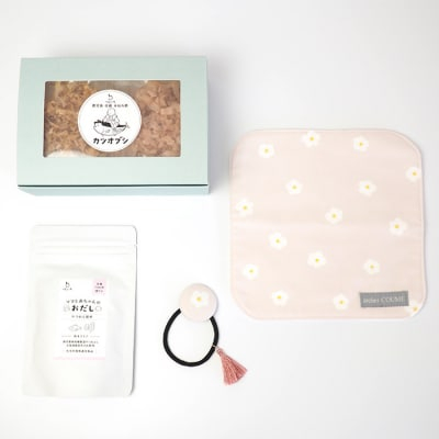 | 容量 | ■内容量■ ・ママと赤ちゃんのおだし かつおと昆布 1P ・鹿児島 枕崎 本枯れ節 カツオブシ10P×1袋 ・atelier COUME ハンカチ 1個 ・atelier COUME ヘアゴム1個 (ハンカチと同柄) ■原材料:お礼品に記載 |