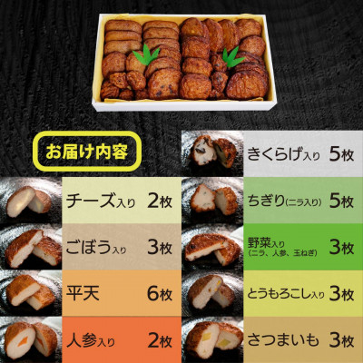 昔ながらの製法で枕崎で製造された豆腐をブレンドしたすり身に、具材には地元の青果店・市場で仕入れた様々な根菜類を中心に、9種類のさつま揚げを化粧箱に32枚詰合せたバラエティなセットとなっております。