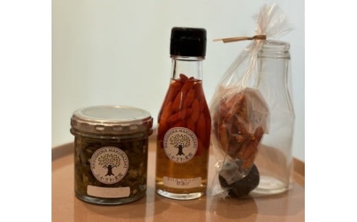 〈ハラペーニョピクルス〉 ピリ辛でいて甘酸っぱい。クセになる味のピクルスです。サンドイッチ・パスタ・チャーハン・焼きそば・ラーメン・唐揚げ・焼き肉・揚げ魚・カレー・餃子等々何にでも合い、料理の味がピリッと引き立ちます。 ピリ辛ハラペーニョ(栽培期間中農薬不使用)を一つ一つ丁寧に刻み、酢・砂糖・塩のみを使ってピクルスにしました。余計なものは一切入れていません。塩は坊津の塩(海水の粗塩)を使用しています。 〈タバスコペッパー酢漬け〉 とっても辛い生唐辛子「タバスコペッパー」を酢漬けにしました。揚げ物・お刺身・チャーハン・餃子・ハンバーグ・煮物にも。何にでもチョイがけしたくなる美味しさです。タバスコペッパー(栽培期間中農薬不使用)は生で食べると激辛ですが、お酢に漬けることによってマイルドになり中辛以上がお好きな方には美味しい辛さが味わえます。 〈自分で作る!タバスコオイル〉 とっても辛い唐辛子「タバスコペッパー」を乾燥させました。これを付属の瓶に全て入れて、お好みのオリーブオイルを注ぐだけ。2週間程待つと、とっても美味しいタバスコオイルの完成です! 揚げ物・チャーハン・餃子・ハンバーグ・パスタ・ピザなどにも。常温で保存出来て、美味しくて、手放せなくなります。タバスコペッパーは、オリーブオイルに漬けることによってマイルドになりますが、日がたつにつれ、辛くなりますので、少量ずつお召し上がりください。 ハラペーニョ・タバスコペッパーは栽培期間中農薬不使用で大切に育てています。 ■生産者の声 ●ふかざわ農園について 枕崎市で耕作放棄地を再生し、ニホンミツバチの飼育をしながらたくさんの種類の果物や野菜などを育てています。農薬に敏感なハチの飼育をしているため、栽培期間中、出来るだけ農薬は使用しない栽培をしております。 大切に育てた果物でジャム・マーマレードなどを手作りしています。安心して美味しく食べられるものをお届けしています。 ■注意事項/その他 ※画像はイメージです。お届けはハラペーニョピクルス120g、タバスコペッパー酢漬け90g、乾燥タバスコペッパー10gと専用容器1瓶です。 【地場産品類型 3号】付加価値の半分を一定程度以上上回る割合が区域内で行われる工程によるものであるため