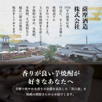 | 容量 | ■お礼品の内容について ・黒白波[900ml×2P] 製造地:鹿児島県枕崎市 ■原材料・成分 品目:単式蒸留しょうちゅう 原材料:さつまいも・米こうじ アルコール度数:25度 |
