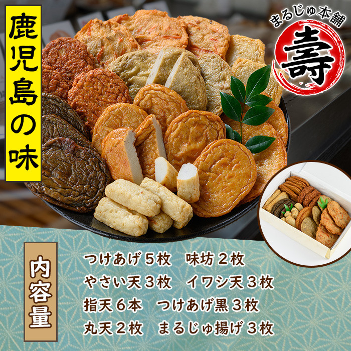 | 容量 | ・つけあげ×5枚 ・味坊×2枚 ・やさい天×3枚 ・イワシ天×3枚 ・指天×6本 ・つけあげ黒×3枚 ・丸天×2枚 ・まるじゅ揚げ×3枚 ※化粧箱入り |