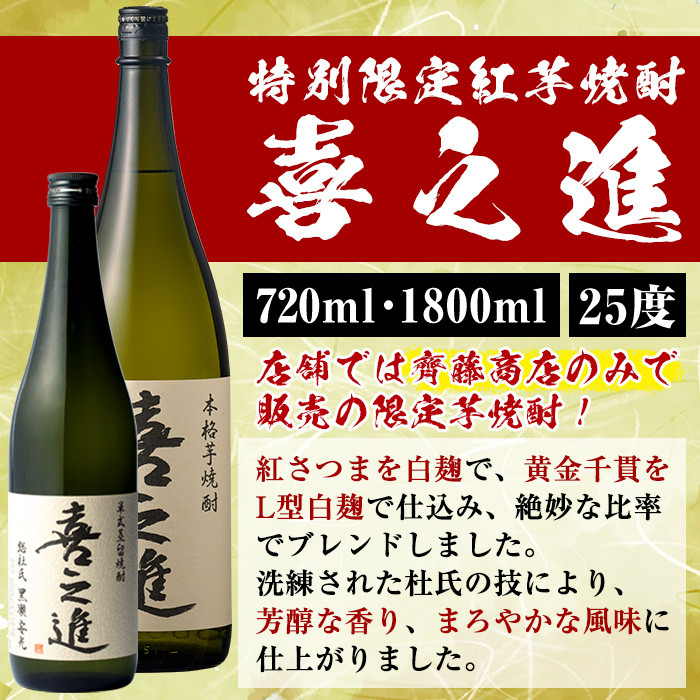 | 容量 | 喜之進:720ml×2本 (25度) 喜之進:1,800ml×2本 (25度) |