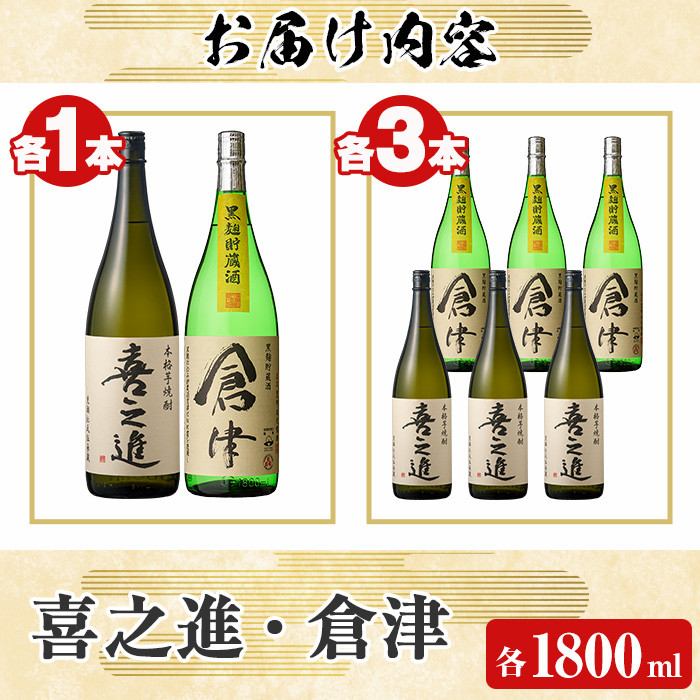 齊藤商店イチオシの焼酎をお届け! <本数が選べる!>薩摩焼酎「喜之進」と「倉津」セット (各1800ml×合計2~6本) 1升瓶 国産 焼酎 いも焼酎 お酒 アルコール 水割り お湯割り ロック【齊藤商店】