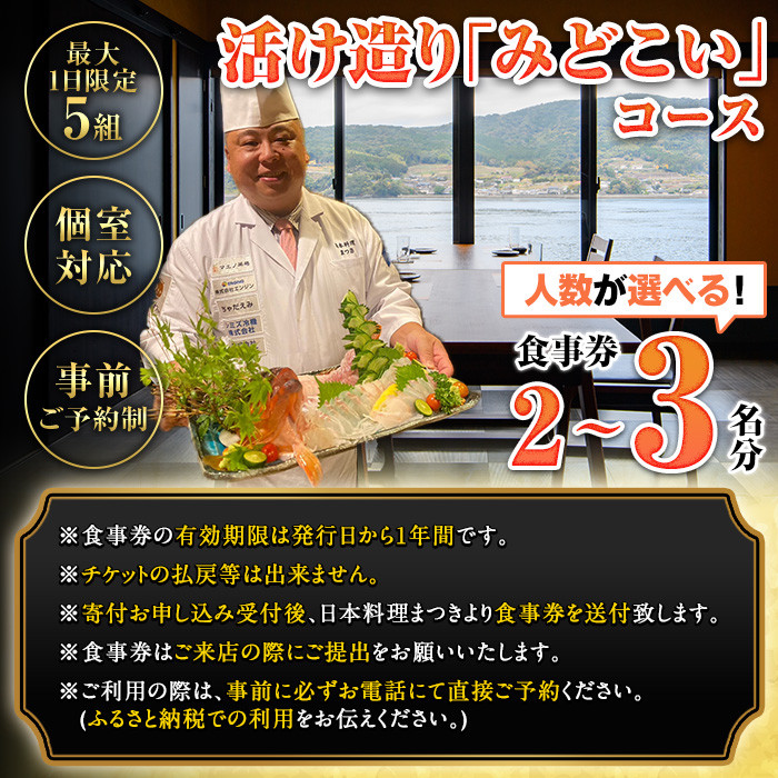 個室対応!料理人自らお客様の前で心を込めて食材を捌き丹念に盛り付けます! <人数が選べる!>活け造り「みどこい」コース食事券(2~3名分) 食事券 活け造り 個室 天然魚 料理 日本料理 漁師の店 コース料理 魚介類 チケット 海鮮 海の幸 ディナー ランチ お食事券 予約制 【日本料理まつき】