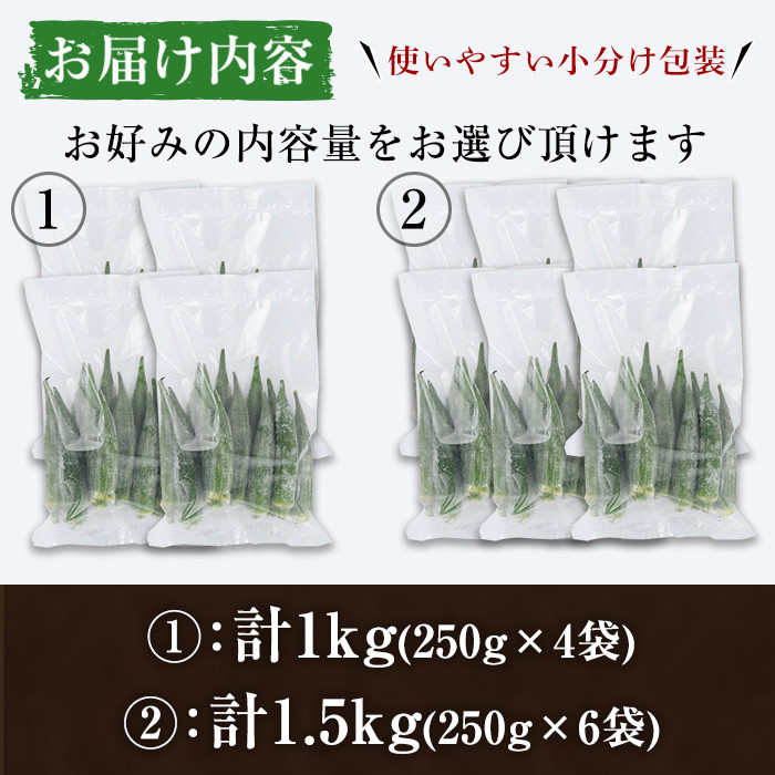 朝収穫し、新鮮なその日のうちに冷凍しました! <内容量が選べる!>数量限定!冷凍オクラ(計1~1.5kg・250g/袋) 野菜 冷凍 冷凍野菜 夏野菜 オクラ ホール カット 簡単 手軽 小分け 数量限定【合同会社グッドフィールド】