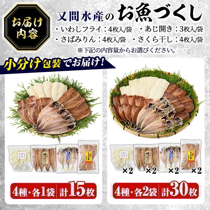地域の生産者応援の品 <農林水産大臣賞受賞工場>刺身で食べられるほど新鮮な魚を干物やフライに!訳あり <内容量が選べる!>訳あり!又間水産のお魚づくし(4種・計15~30枚) 国産 ひもの 魚介 小分け 個包装 詰め合わせ 干物セット みりん干し アジ あじ 開き 鯵 サバ さば 鯖 鰯 いわし イワシ フライ おかず おつまみ【又間水産】