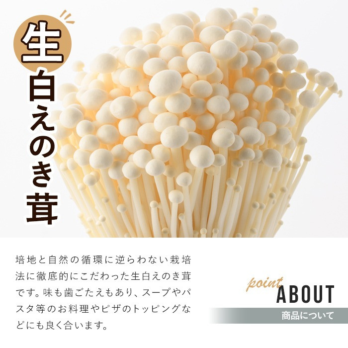 培地と自然の循環に逆らわない栽培法に徹底的にこだわった生白えのき茸です。味も歯ごたえもあり、スープやパスタ等のお料理やピザのトッピングなどにも良く合います。