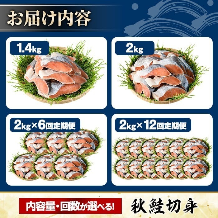 | 容量 | ▼下記からお選びいただけます。 ・秋鮭切身:1.4kg ・秋鮭切身:2kg ・秋鮭切身:<定期便・全6回>2kg×6回 計12kg ・秋鮭切身:<定期便・全12回>2kg×12回 計24kg ※選択肢によって寄附額が異なりますのでご注意ください。 |