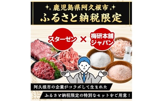 企業コラボによる「阿久根市のふるさと納税」だけでしか手に入らない特別なセット! 鹿児島県産黒毛和牛(経産)切り落とし(計1.2kg)とピンク岩塩(あら塩・200g/ボトル付) セット 国産 九州産 鹿児島県産 牛肉 国産牛 岩塩 ピンク岩塩 あら塩 ボトル 付き ふるさと納税限定 企業 コラボ【スターゼン×梅研本舗ジャパン】akn501-03