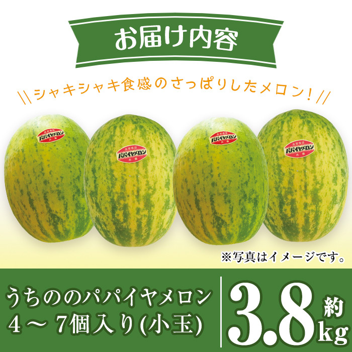 地面につかないこだわりの立体栽培で育てたメロン! i457 <2026年4月中旬~5月中旬の間に発送予定>うちののパパイヤメロン小玉(計約3.8kg・4~7個入) メロン パパイヤメロン 果物 くだもの フルーツ 期間限定 数量限定 旬 立体栽培 シャキシャキ食感 ギフト 贈り物 おやつ 【山ん神】