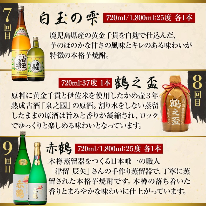 | 容量 | <1回目> ・出水に舞姫(900ml)×1本 ・出水に舞姫(1800ml)×1本 <2回目> ・兵児盃【木箱】(720ml)×1本 <3回目> ・出水の手造り梅酒(500ml)×2本 <4回目> ・極上出水に舞姫【ギフト箱】(720ml)×1本 ・真鶴の里(720ml)×1本 <5回目> ・出水は鶴之里(900ml)×1本 ・出水は鶴之里(1800ml)×1本 <6回目> ・鶴之國【木箱】(720ml)×1本 <7回目> ・白玉の雫(720ml):×1本 ・白玉の雫(1800ml):×1本 <8回目> ・鶴之盃【木箱】(720ml)×1本 <9回目> ・赤鶴(720ml):×1本 ・赤鶴(1800ml):×1本 <10回目> ・杜盃【木箱】(720ml)×1本 <11回目> ・ボヌール【木箱】(720ml)×1本 <12回目> ・フォルトゥーナ【木箱】(720ml)×1本 |