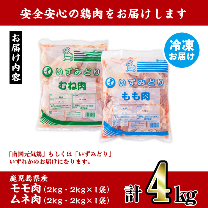 唐揚げやソテーに!安全安心のとり肉をお届けします。 i929 鹿児島県産鶏肉!モモ肉・ムネ肉(計4kg・2kg×各1P) 肉 鶏肉 もも肉 むね肉 国産 からあげ ソテー 鶏料理 冷凍【スーパーよしだ】