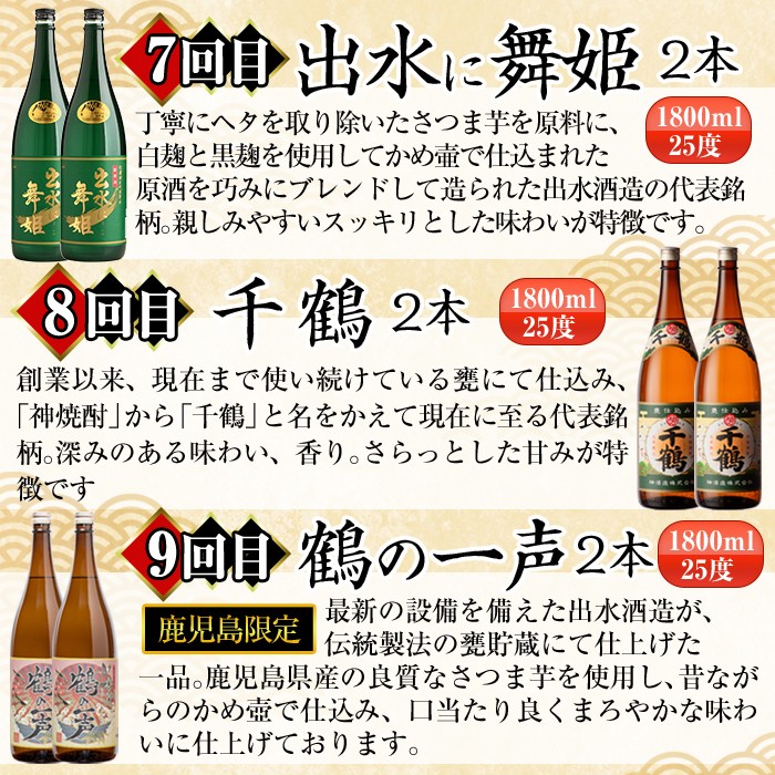 | 容量 | <1回目> 鶴乃泉(25度):1800ml×2本 <2回目> 薩摩古秘(25度):1800ml×2本 <3回目> 翔鶴(25度):1800ml×2本 <4回目> 酔々(25度):1800ml×2本 <5回目> 南部鶴(25度):1800ml×2本 <6回目> 出水は鶴之里(25度):1800ml×2本 <7回目> 出水に舞姫(25度):1800ml×2本 <8回目> 千鶴(25度):1800ml×2本 <9回目> 鶴の一声(25度):1800ml×2本 <10回目> さつま木挽 黒(25度):1800ml×2本 <11回目> 薩摩乃粋(25度):1800ml×2本 <12回目> さつま木挽(25度):1800ml×2本 |