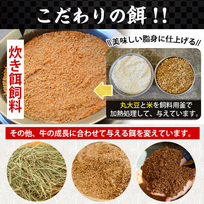 牛への健康管理を心掛け、15年かけて完成したオリジナル飼料の配合(発酵飼料、米粉、河内菌の黒麹、など)や餌への添加物不使用により高品質で安心、安全なお肉になるように仕上げております。また、お米と大豆を専用の窯で40分じっくり炊いた『炊き餌』を与えることにより口の中でとろける甘みとコクのある味わいをお楽しみいただけます。
