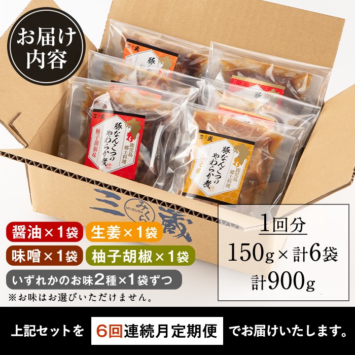 常温保存OK!4種類の味をお届け! i1197-B <定期便・計6回(連続)>九州産豚なんこつのやわらか煮セット<(150g×6個・計900g)×全6回> 常温 常温保存 豚肉 軟骨 定期便 6回 醤油 生姜 柚子胡椒 味噌 おかず おつまみ お惣菜 セット 地元食材 コラーゲン レンチン 【西尾】